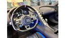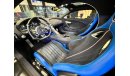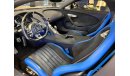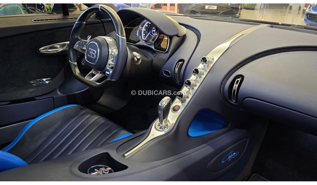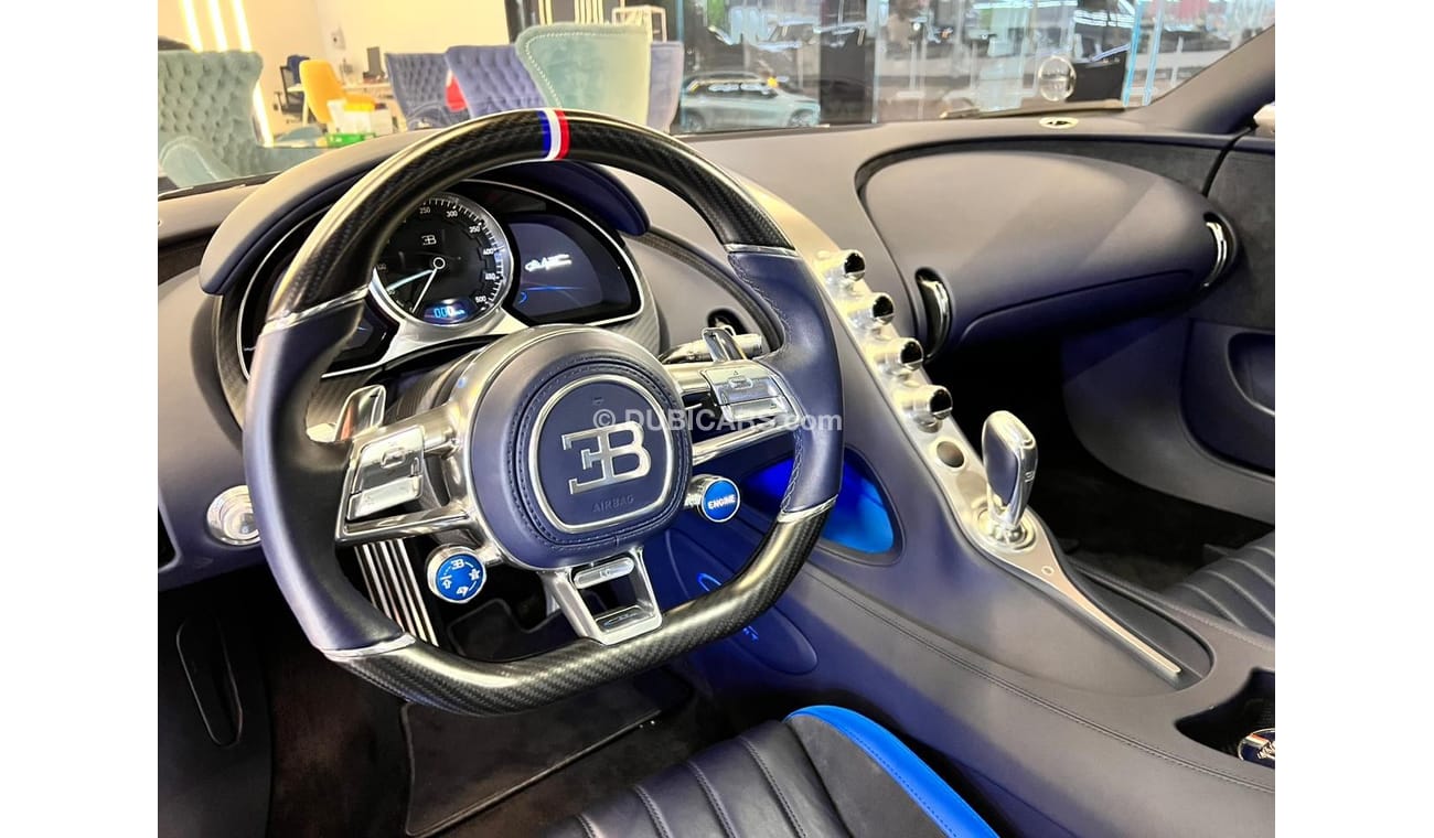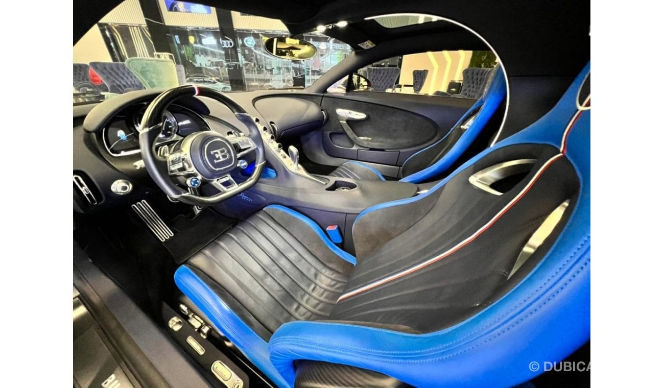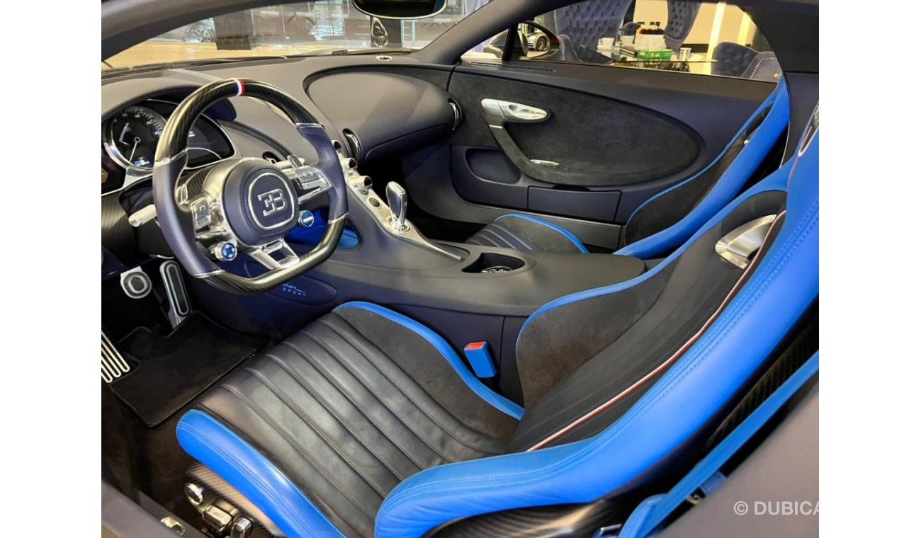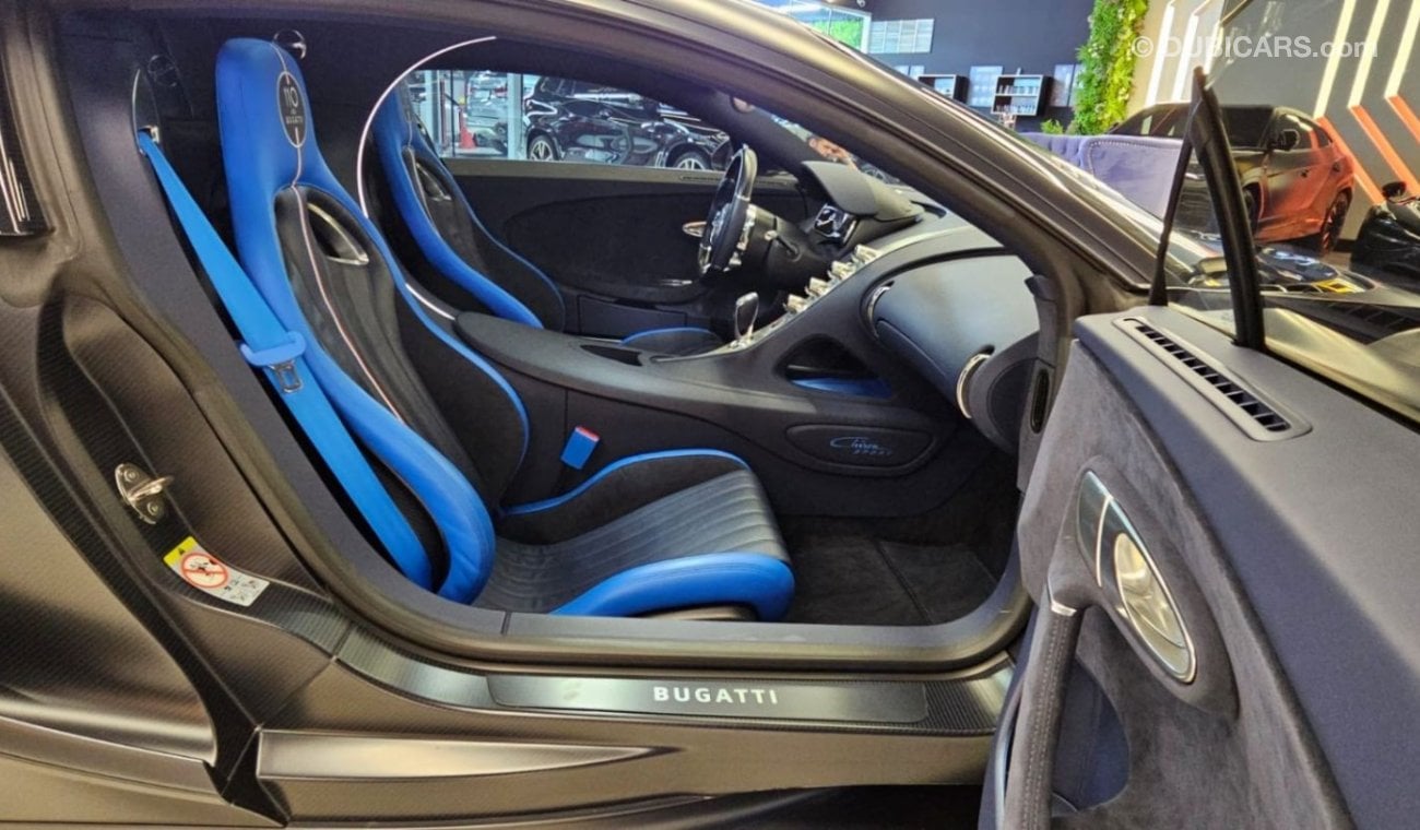 Inside, the Chiron 110 Anniversary features an exclusive Sky View glass roof, which offers passengers a panoramic view of the sky above. The seats are upholstered in two-tone Deep Blue leather and Alcantara, with French Racing Blue stitching and accents. The headrests also feature an embroidered "110 Ans Bugatti" logo. The car is equipped with a premium sound system, an advanced infotainment system, and a range of driver assistance technologies.