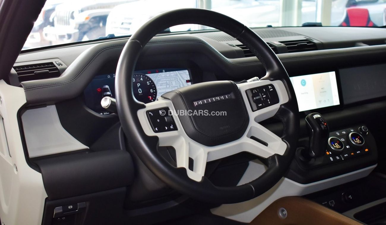 Used Land Rover Defender P400 for sale in Dubai. Grey/Silver 2021 model, available at Al Muwafaq Motors. This car has automatic transmission, a 6 cylinder engine, 20″ wheels and black interior. 44,000 km, GCC specs.