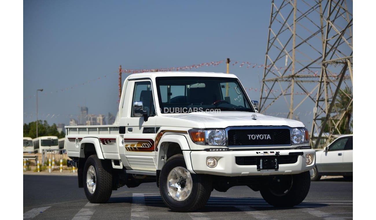 New Toyota Land Cruiser Pick Up Single Cab DLX V6 4.0L Petrol 4X4 Manual Transmission - Euro 4 for sale from Sahara Motors in Dubai. Yellow 2022 model. The car has manual gearbox, 6 cylinder engine, 16″ wheels and grey interior. GCC specs.