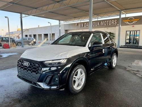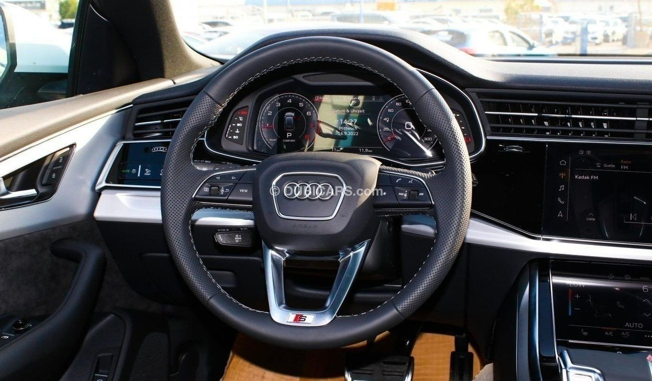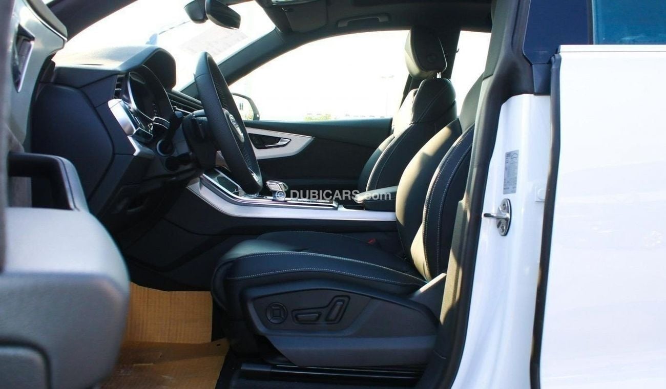 Brand new Audi Q8 55 TFSI Quattro S Line for sale in Dubai. white 2023 model, available at Story Auto Middle East FZE. This car has automatic transmission, 6 cylinder engine, 21″ wheels and black interior. European specs.