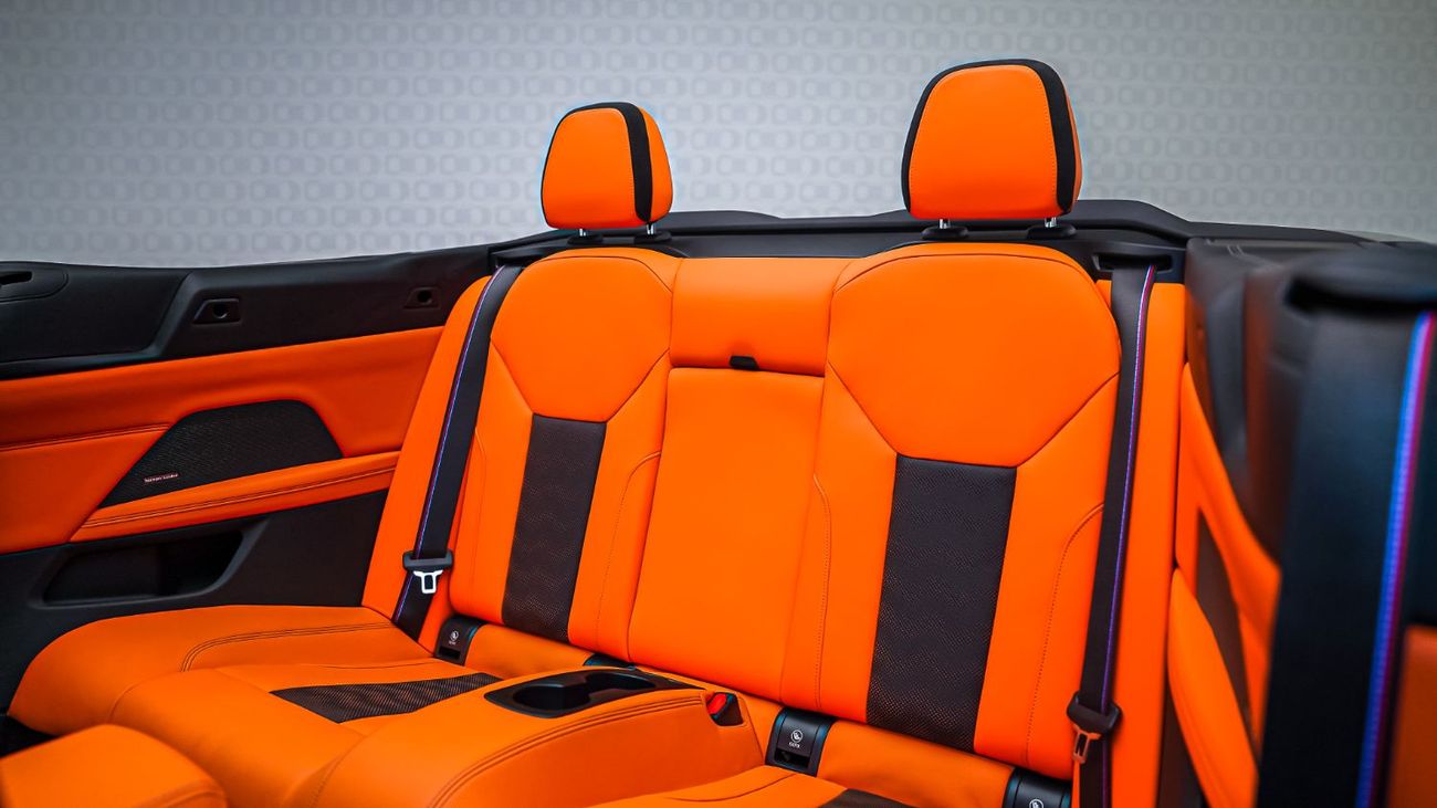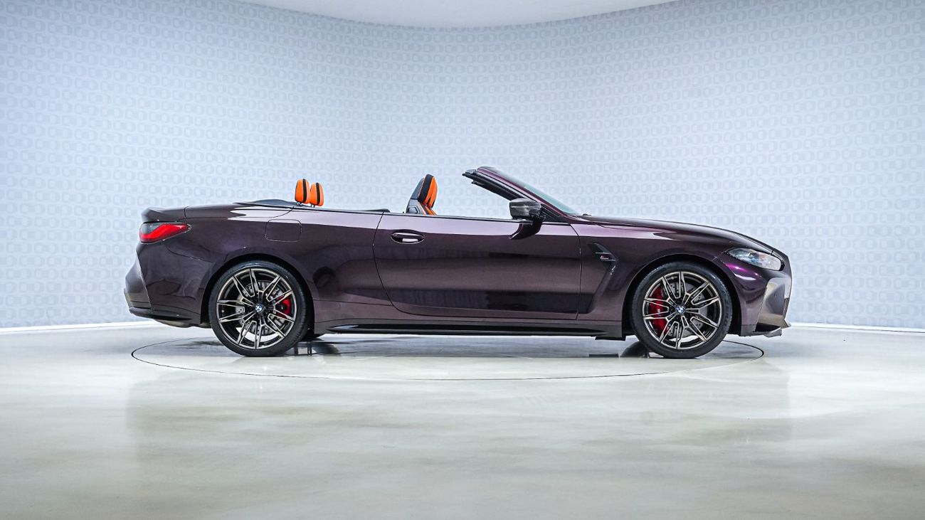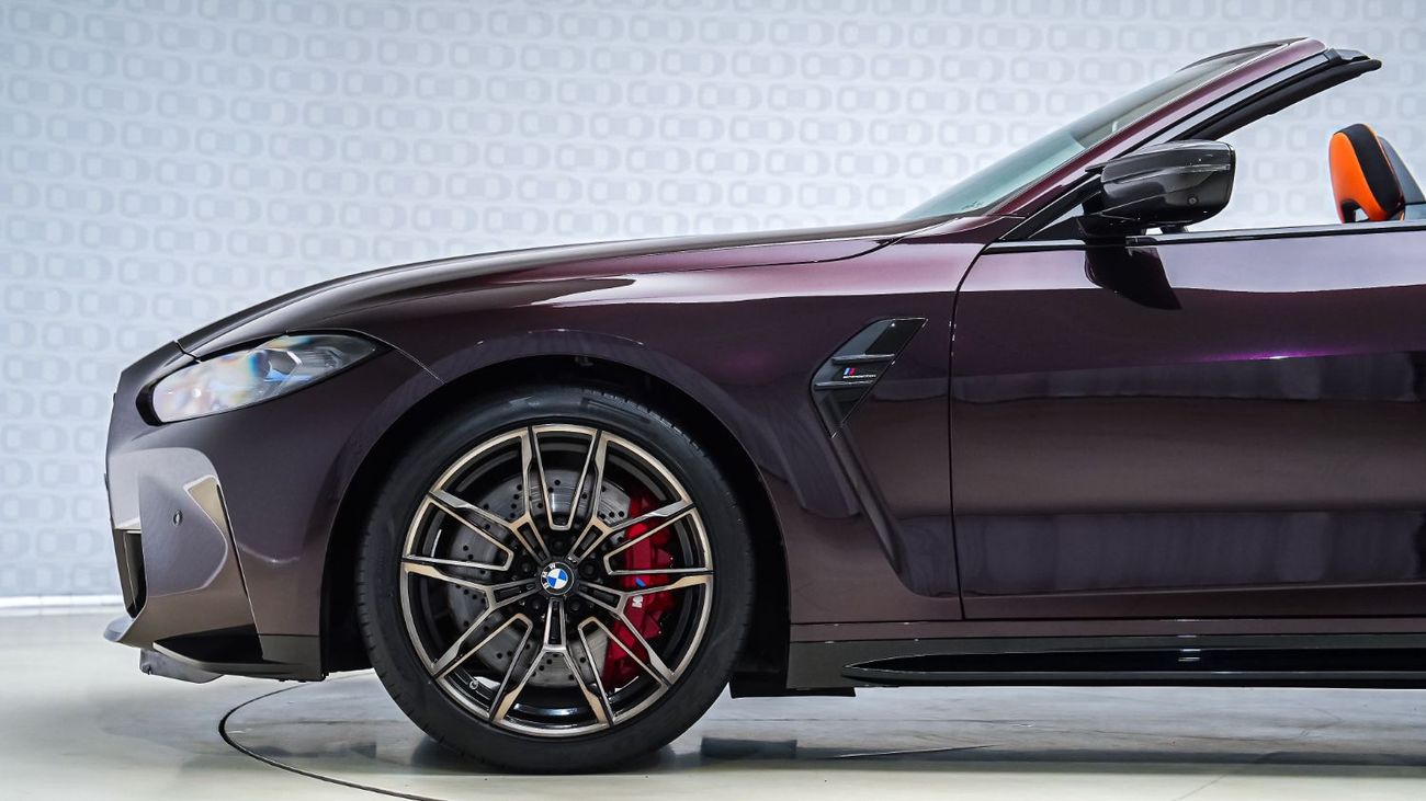 The 2023 BMW M4 Competition Convertible stands out as one of the most striking performance cabriolets on the market, and this example raises the bar even higher. Finished in the rare and dramatic ‘Blackberry’, a deep metallic purple PPF that shimmers with richness under the sun, it’s perfectly offset by the bold Kyalami Orange full Merino leather interior. The look is completed by the anthracite ‘denim’ effect roof, adding a sophisticated texture that balances its vibrant character.