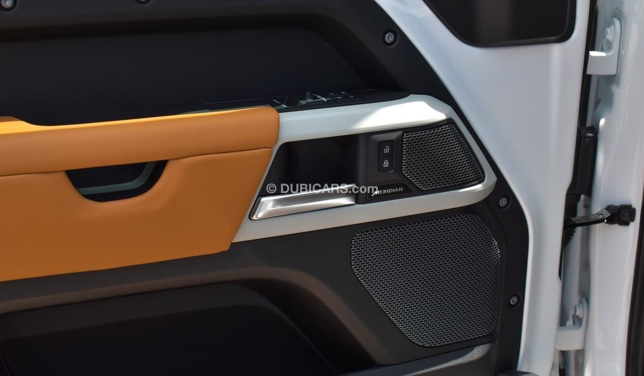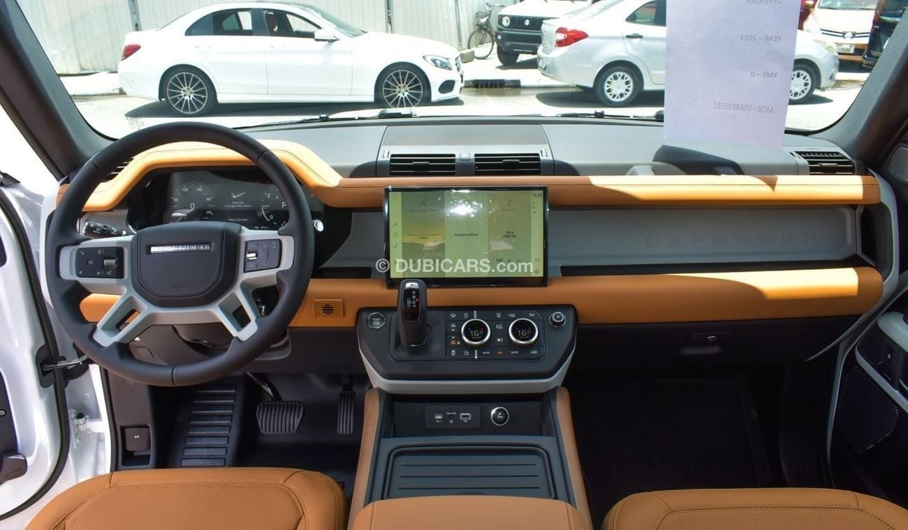New Land Rover Defender for sale from Al Muwafaq Motors in Dubai. White 2023 model. The car has automatic gearbox, 6 cylinder engine, 20″ wheels and tan interior. GCC specs.