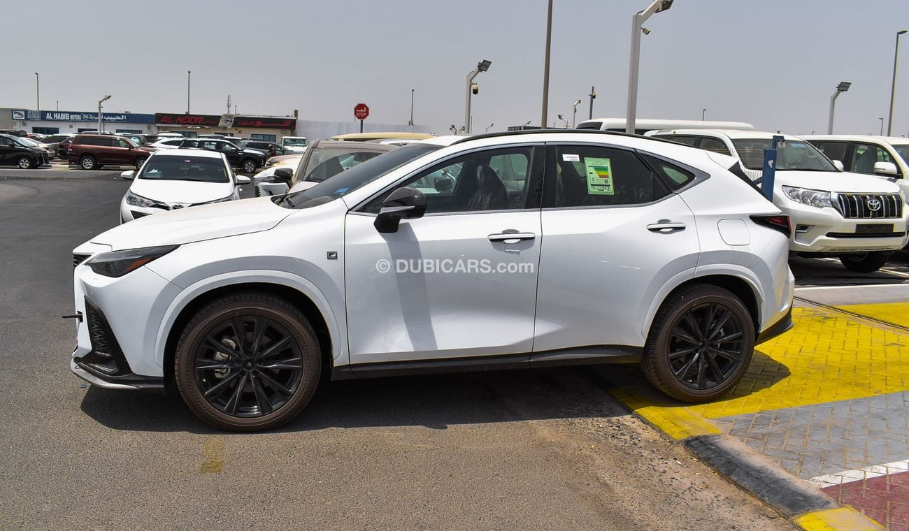 New Lexus NX350 2.4L for sale from GT Motors in Dubai. White 2023 model. The car has automatic gearbox, 4 cylinder engine, 20″ wheels and red interior. GCC specs.