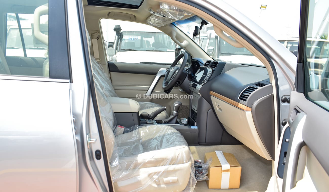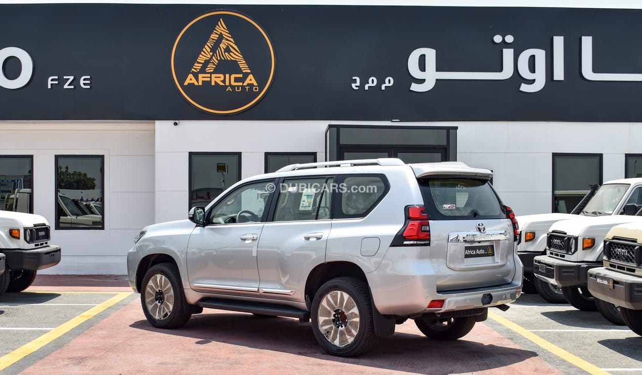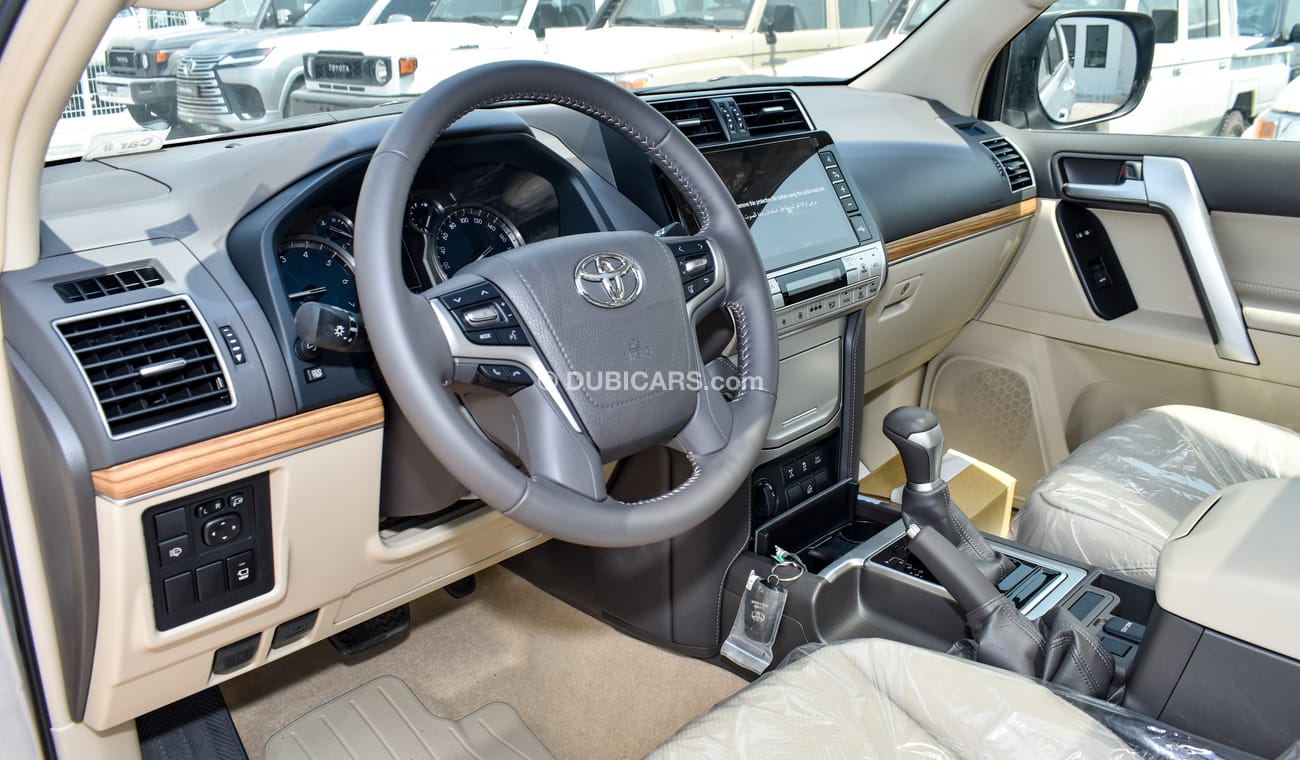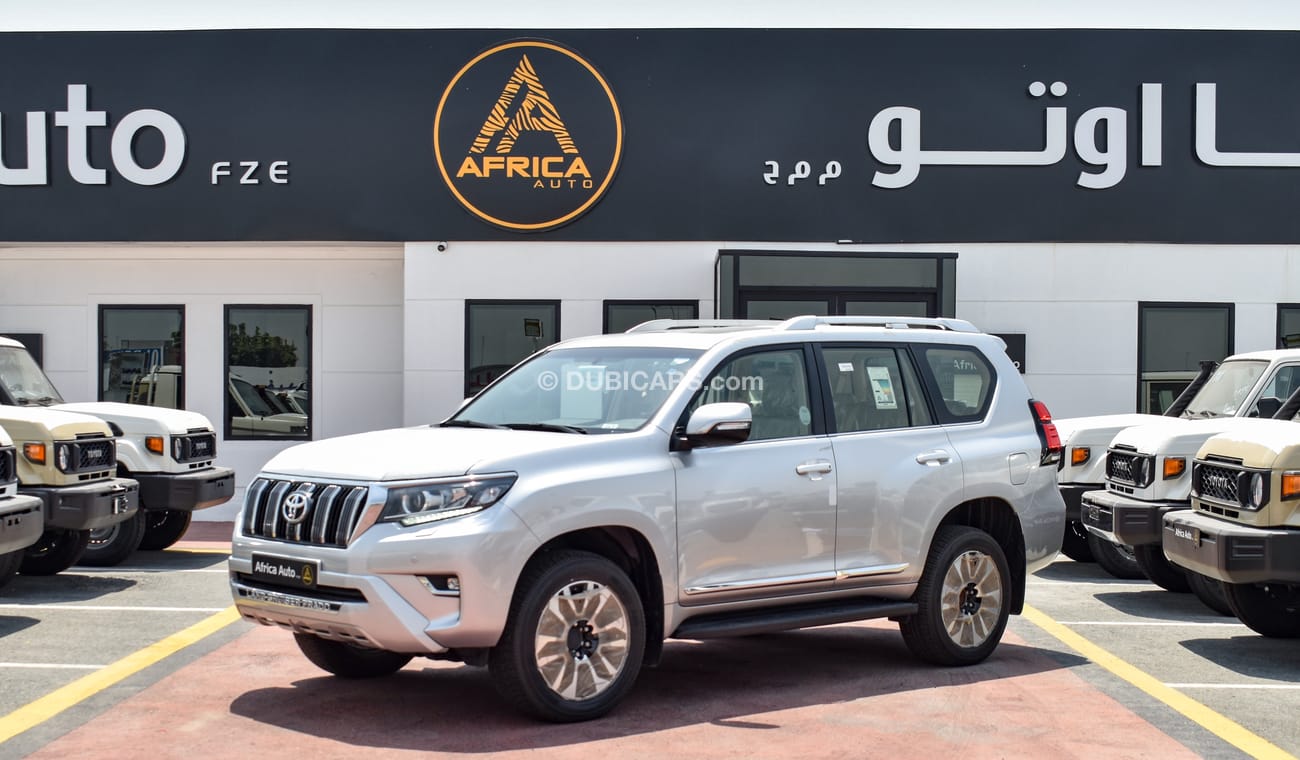 Brand new Toyota Prado VX for sale in Dubai. Silver 2023 model, available at Africa Auto. This car has automatic transmission, 6 cylinder engine, 19″ wheels and beige interior. GCC specs.