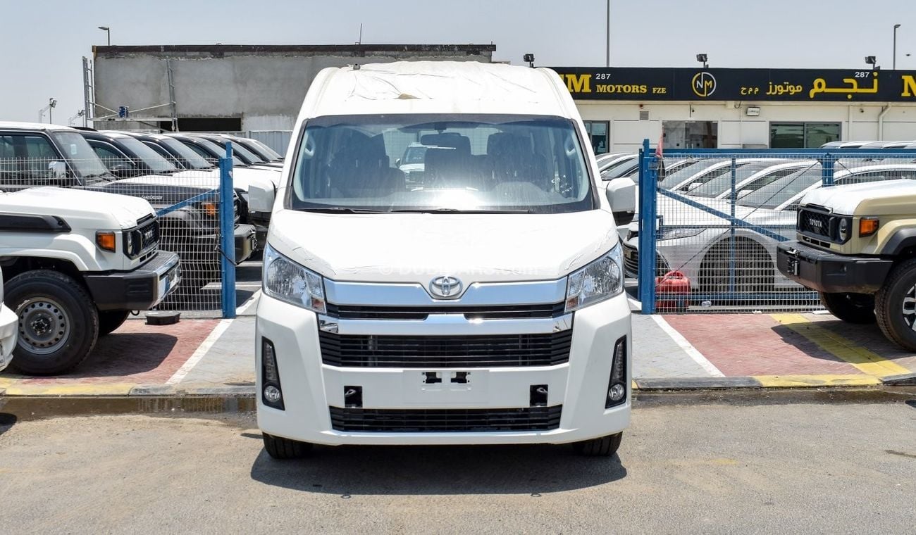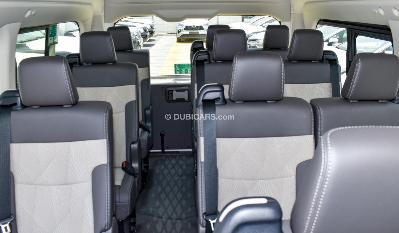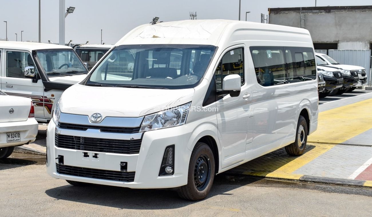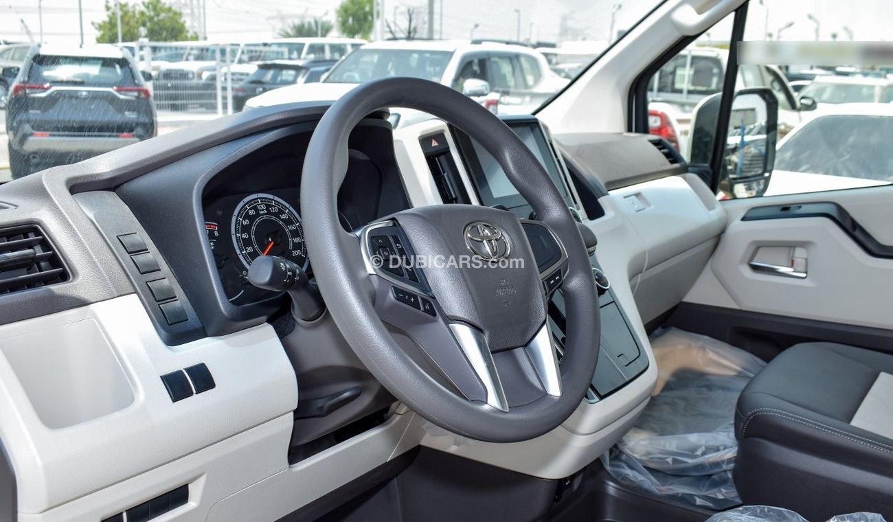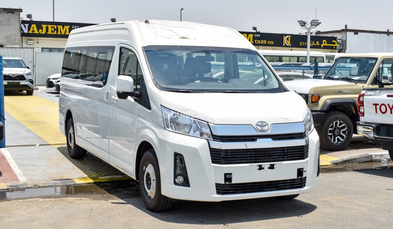 New Toyota Hiace GL for sale from Najem Motors FZE in Dubai. White 2024 model. The car has automatic gearbox, 6 cylinder engine, 16″ wheels and beige interior. GCC specs.