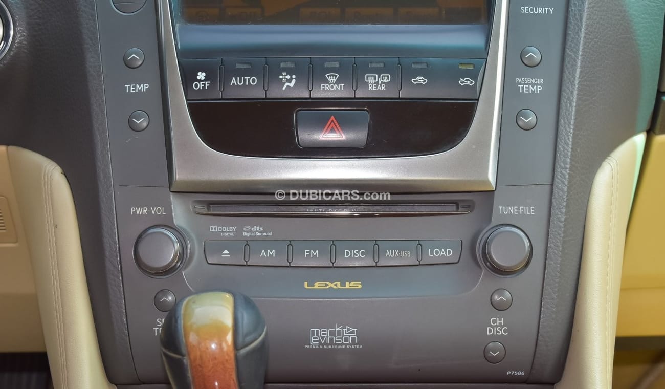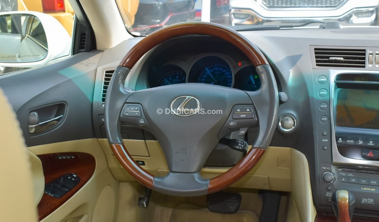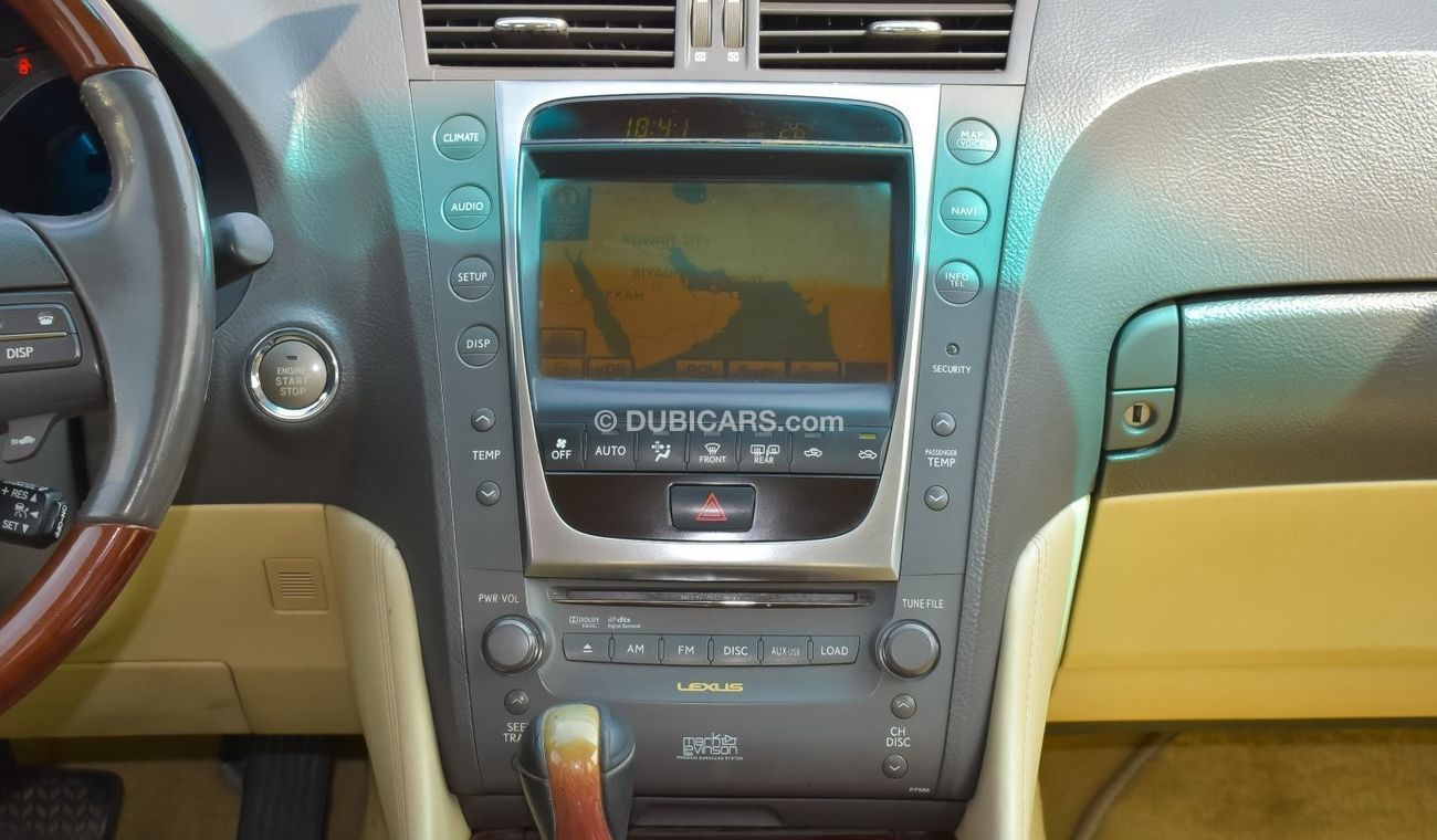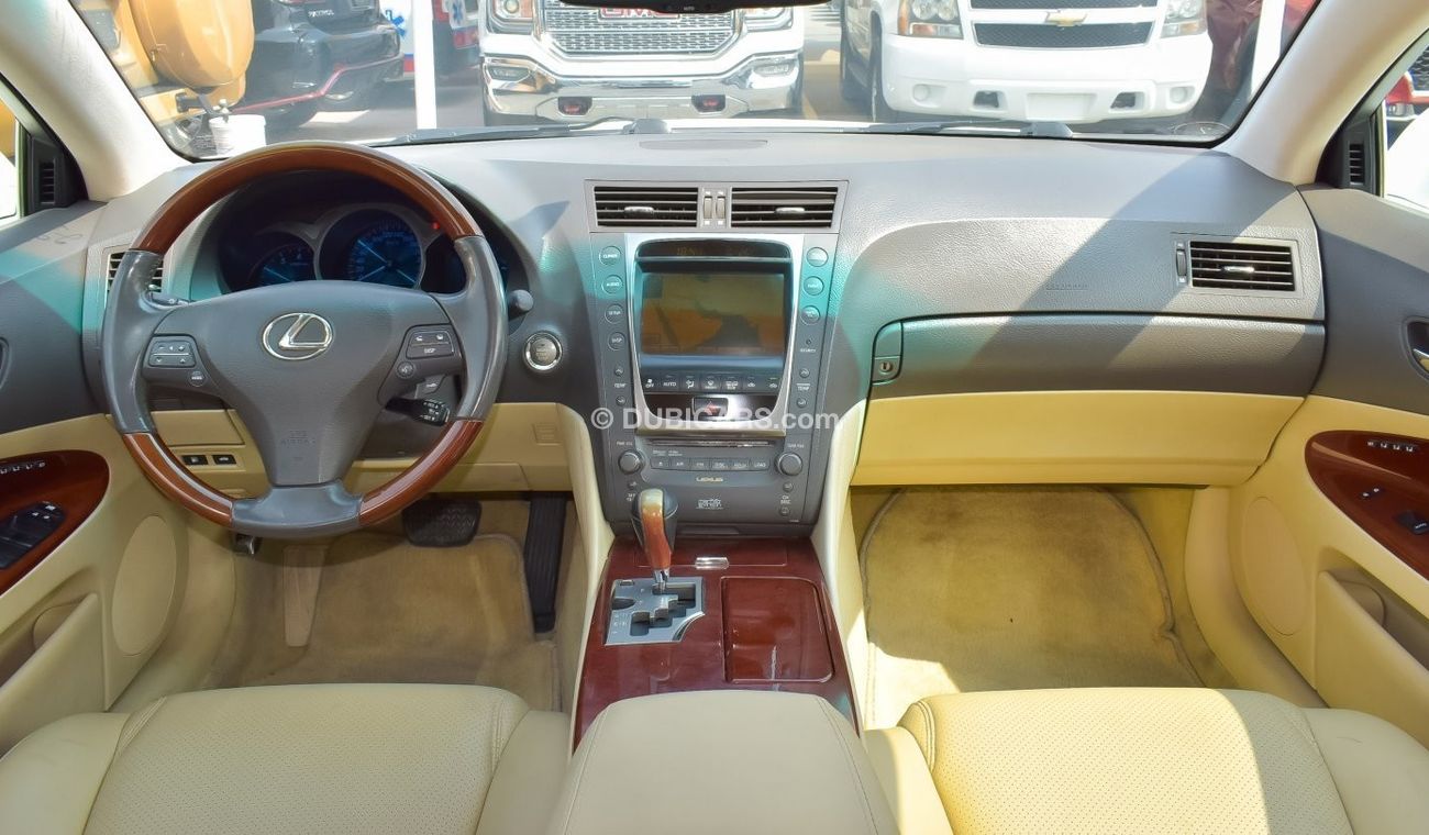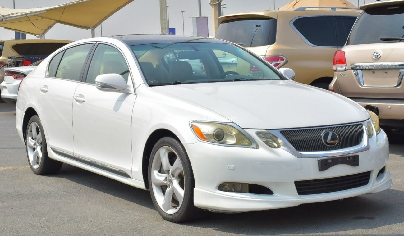 Pre owned Lexus GS 460 for sale in Sharjah by Emirates & Gulf Used Cars 8 cylinder engine, white exterior and automatic transmission. Comes with 18″ wheels and beige interior. 182,300 kilometers on the odometer, GCC specs.