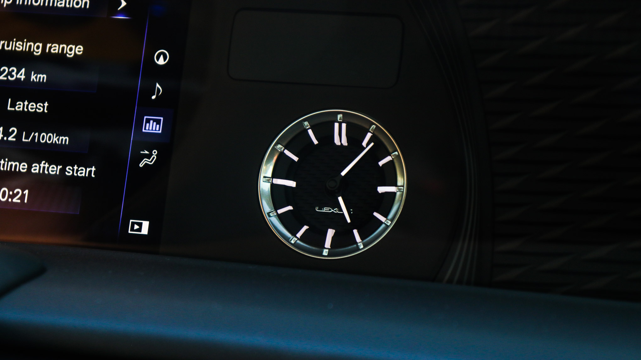 Sitting in the centre console is a sizable infotainment screen which isn’t touchscreen as its shield by plastic that extends past the clock and across the passenger side.