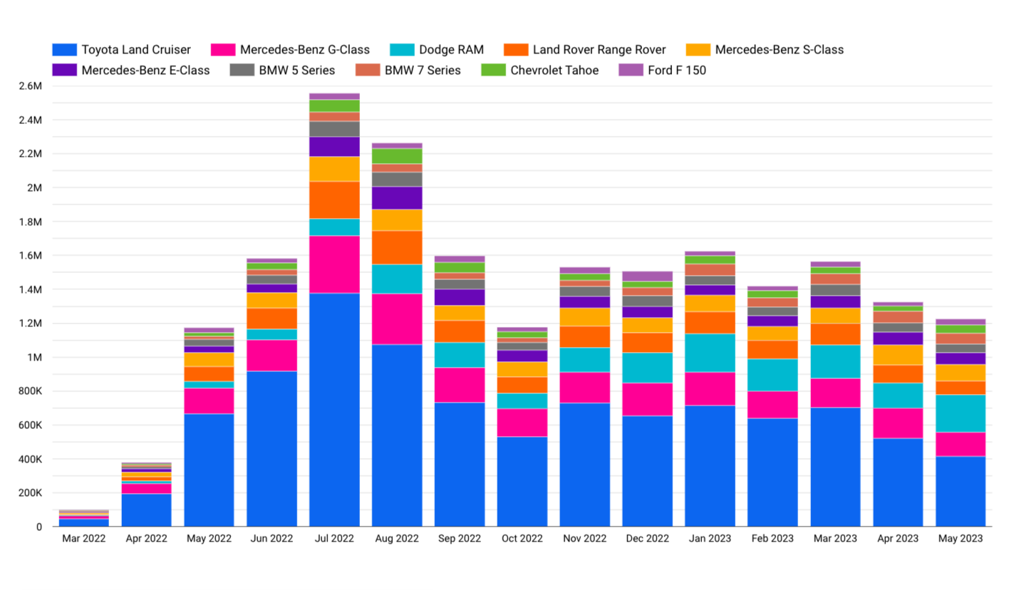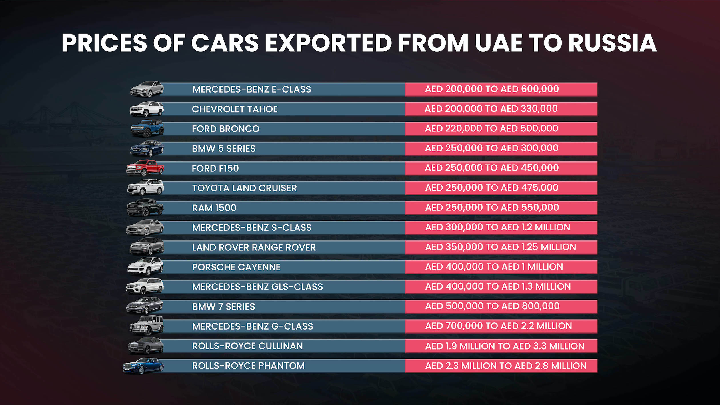 Other cars in demand are the Rolls-Royce Cullinan, Rolls-Royce Phantom, Land Rover Range Rover, Chevrolet Tahoe, Chevrolet Equinox, Porsche Cayenne, etc. The pattern here suggests that large SUVs and ultra-luxurious sedans are the most in-demand exports from the UAE to Russia. According to the data collected, Russian buyers are looking for vehicles that cost between AED 200,000 ($54,500) to AED 2.5 million ($680,000).