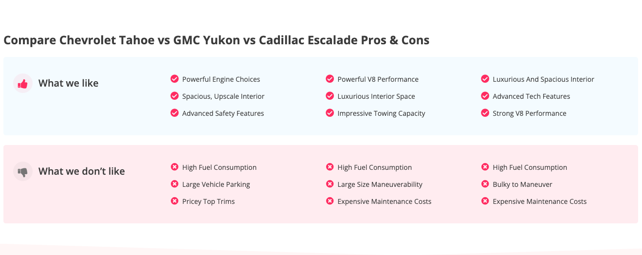 Apart from giving you accurate figures and specifications about the cars you are considering, the DubiCars Car Comparison tool also lets you know the pros and cons of each car. The ‘What We LIke’ & ‘What We Don’t Like’ tables give you a clear idea of the good and bad of the cars you are looking at.