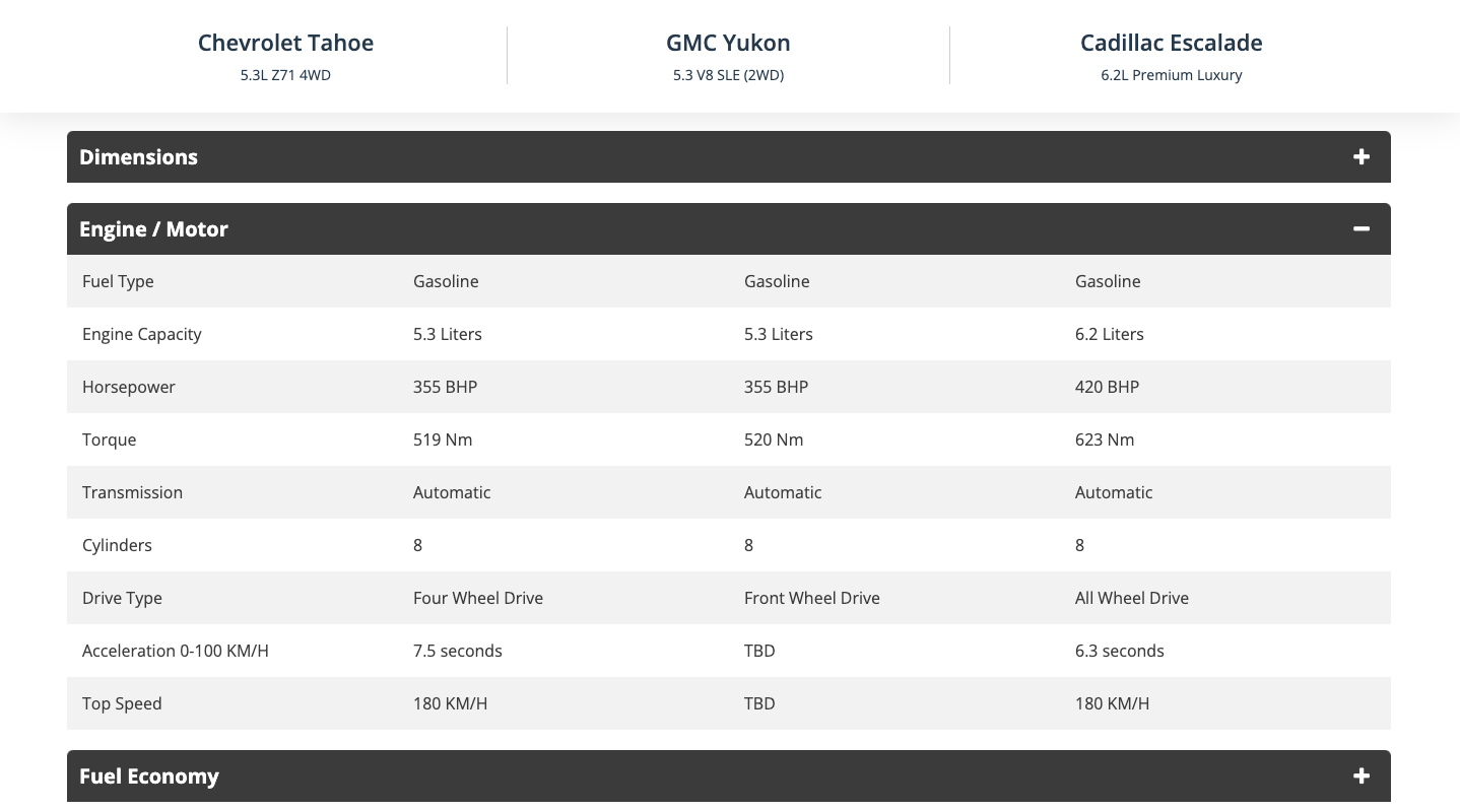 This is the primary use case of a comparison tool like the one DubiCars has integrated into the website. Access to in-detail specifications and features lists is just what you need in order to make an informed purchase decision. On the DubiCars Car Comparison tool, the specifications and features are broadly classified into these categories: