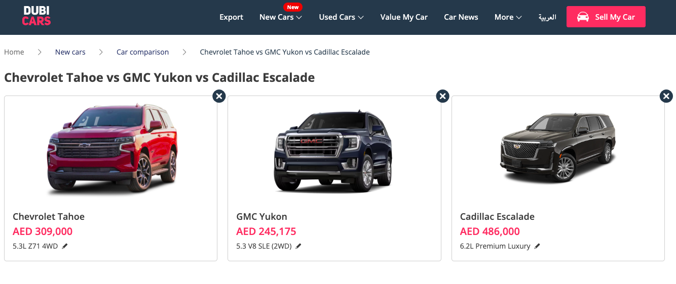 The DubiCars Car Comparison tool will suggest car models for you to compare after it has learnt your preferences through your previous searches. For example, If you’ve been looking at compact SUVs, it will suggest more compact SUVs, and the same logic applies to hatchbacks, sedans, full-size SUVs, pickup trucks, etc.