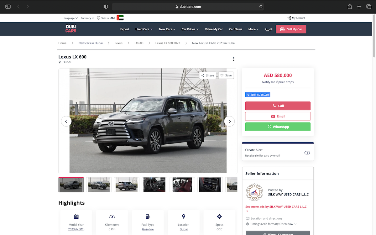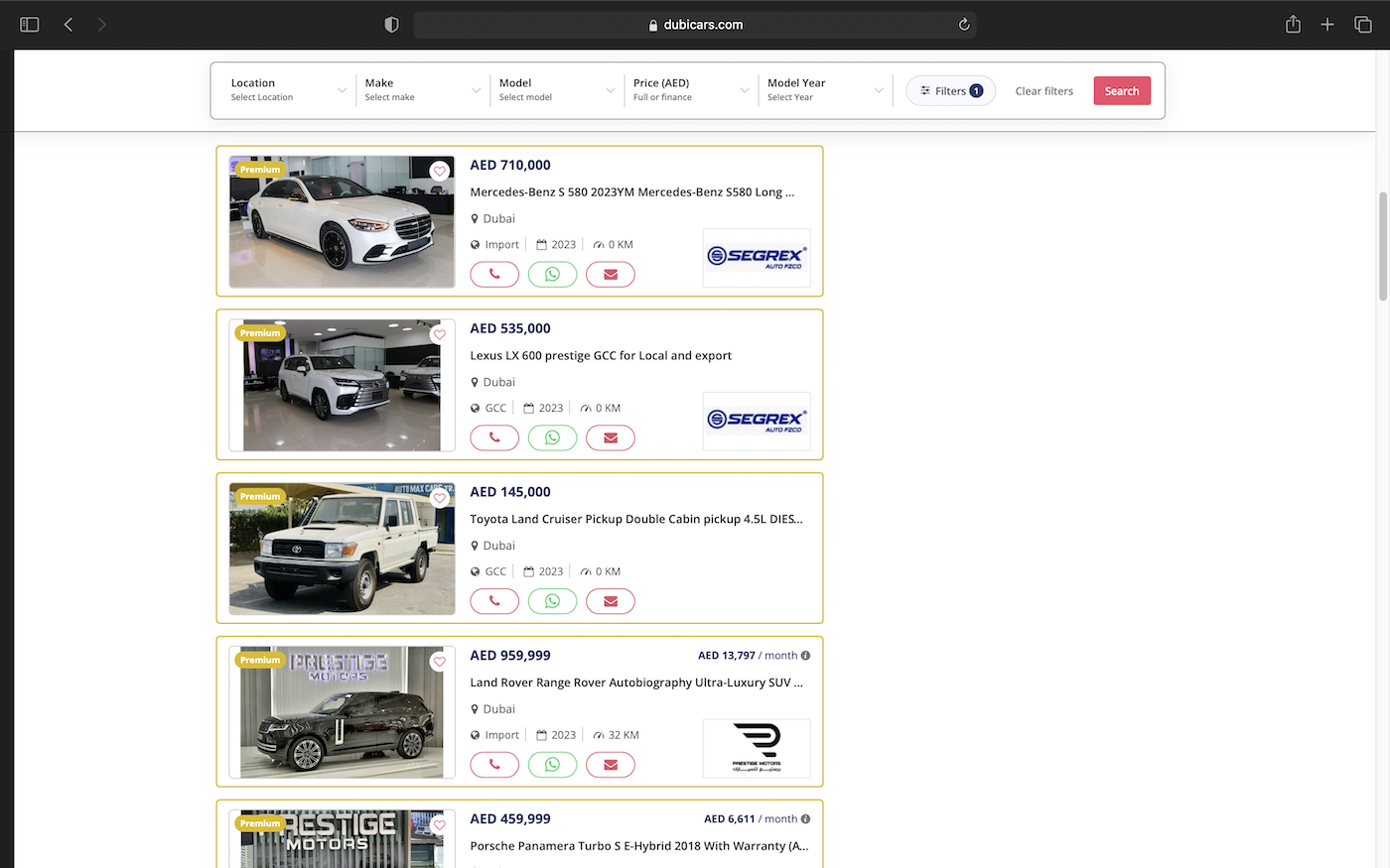 Upon searching for a car, in some cases, there are hundreds of search results and it can sometimes be a little difficult to browse through all of them. DubiCars’ new search results cards feature key car highlights for you to skim through the really important details quickly. The details on the search card include location, specs, year of manufacture, and mileage.