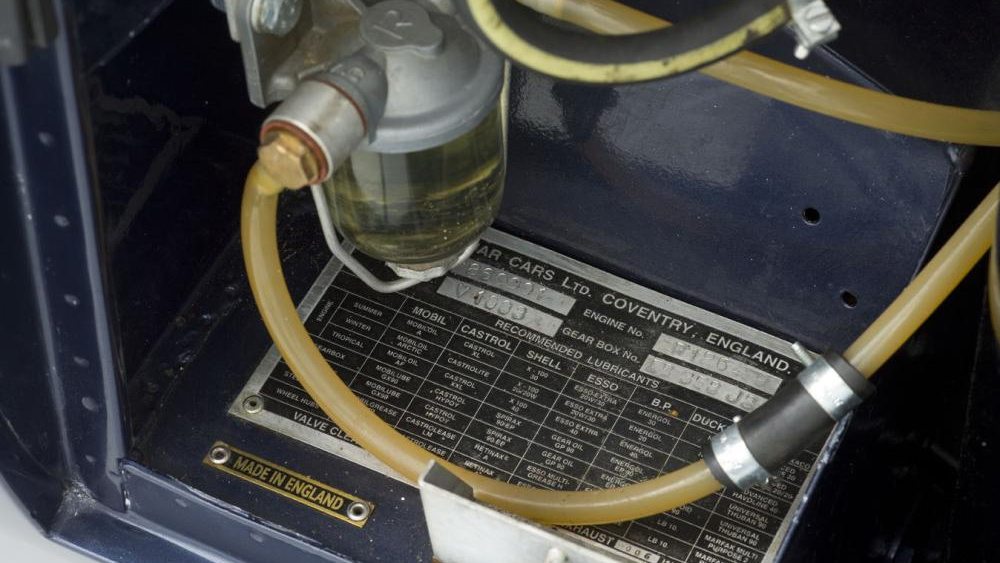 The auction car bearing chassis number 860001 is a right-hand-drive coupe with an opalescent dark blue with a red leather interior. Although exact records of the first owner are missing, it was owned by a Jaguar distributor, Henlys Group PLC.