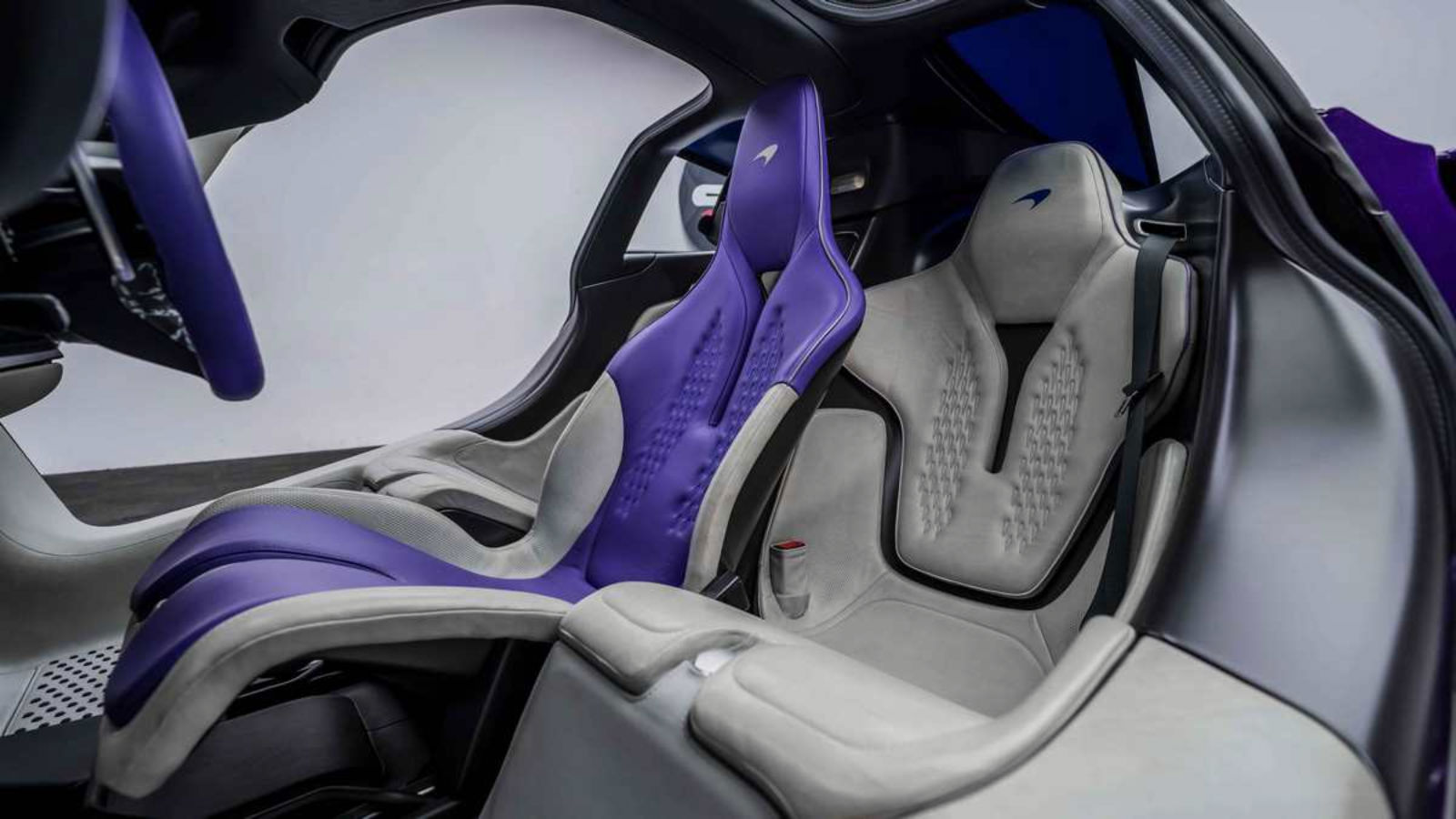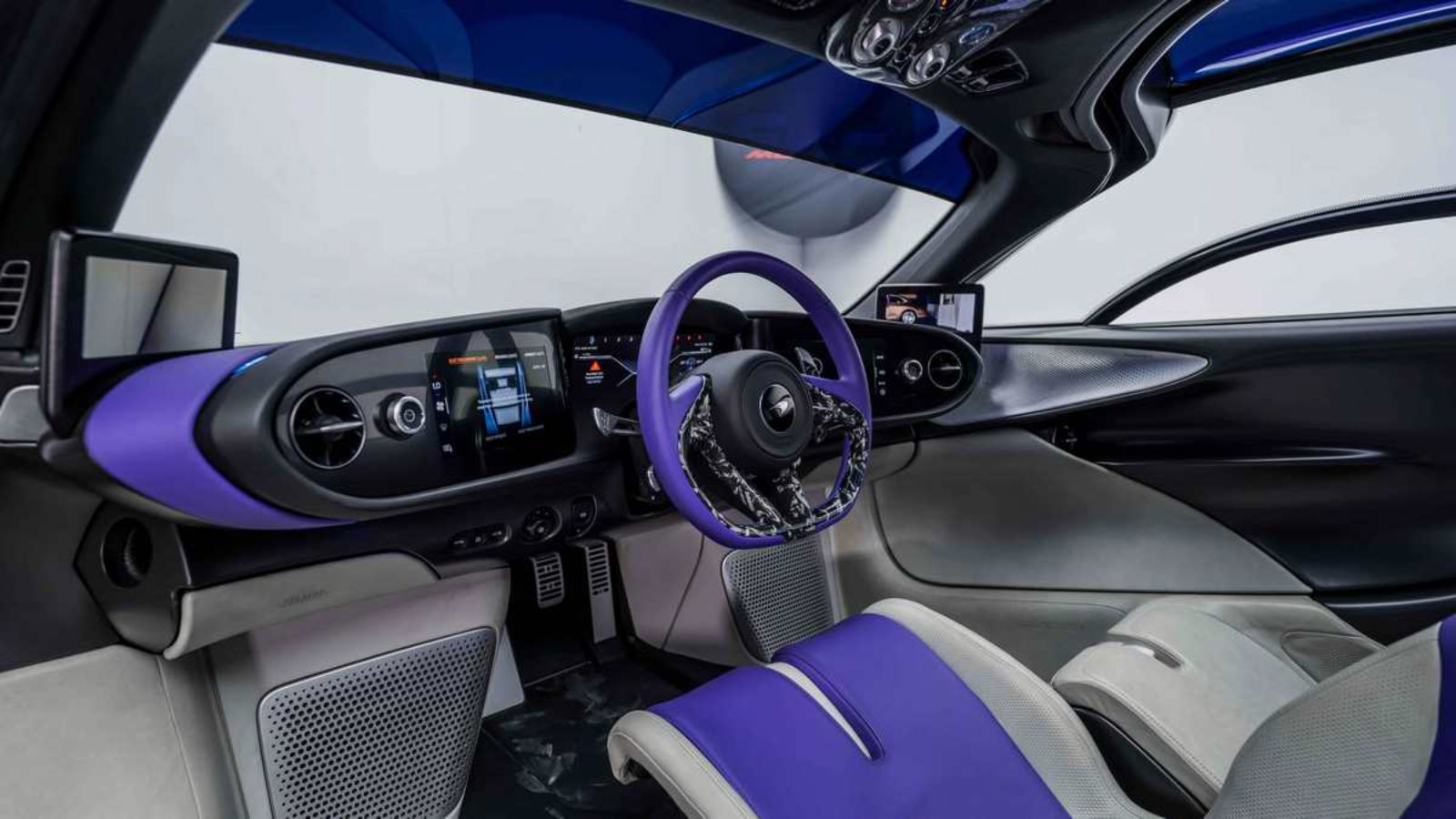 The interior is made of fine leather, Alcantara, and carbon fibre trim is used throughout the cabin, creating a premium and sophisticated look and feel. The Speedail from Al Ain Class Motors features a dual-tone grey and purple interior colour scheme to match the exterior.
