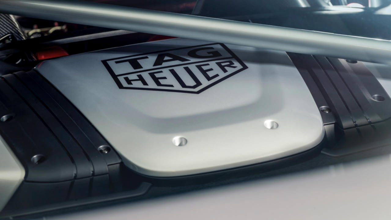 - The hood of both cars features the TAG Heuer logo in a dark shade of grey.
