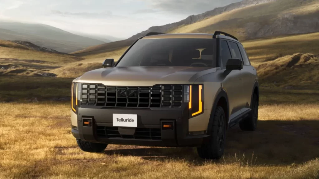The redesigned Telluride introduces a boxier, rugged aesthetic inspired by the EV9, featuring vertical LED lighting and flush door handles. A new turbocharged 2.5-litre hybrid system delivers 329 horsepower, with approximately 30 miles per gallon on the highway and a towing capacity of 5,000 pounds. The 3.8-litre V6 option produces 287 horsepower and can tow up to 5,500 pounds. Dual 12.3-inch displays, wireless Apple CarPlay, Android Auto integration, and physical climate controls enhance the interior. Three-row seating accommodates eight passengers with improved Nappa leather and ventilated second-row options.