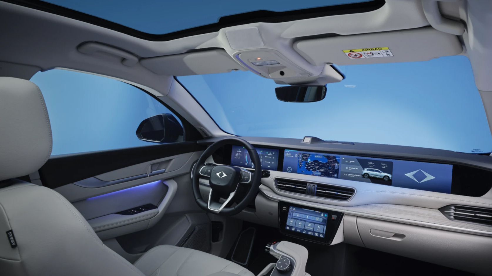 From what we can see, the infotainment system comprises three sections split intelligently for the driver and the passenger. There is also another screen that is placed below the dashboard for other operations of the car including climate control. The floating center console with a rotary drive selector is a brilliant design element in itself. The console also houses a button for the electronic parking brake, regenerative braking control, and a touchpad.